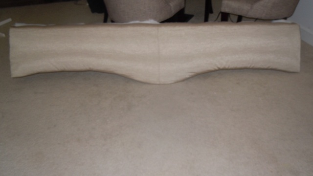 Next was reupholster which turned out to be quite the hassle. It was difficult to accommodate the curve on the cornice panel. Tension from folding around the curved edges created obvious creases throughout the fabric. Little did we know but upholstering a curved suface is quite simple but you must cut the fabric to the shape of the wood. This was a lesson learned the hard way after hours of trials and failures. Overall, the cornice is well-made as I found out during disassembly, complete with a wood base, batting, and multiple layers of fabric to add a softer look.