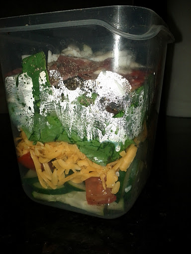 I started with one layer of chopped cucumber, one layer of chopped roma tomatoes (cherry tomatoes would be so lovely here), layer of shredded cheese, layer of black beans, layer of romaine lettuce (dark greens), three cheese ranch dressing, one layer of TURKEY bacon and finally one egg boiled and sliced. I omitted the yolk to use for my son's breakfast. Finally, I cracked some black pepper over top to season. My Hubbie actually hates the taste of egg so this last step is a must in our home. If you leave the layers until you are ready to eat, this meal is a treat for the eyes and your taste buds.